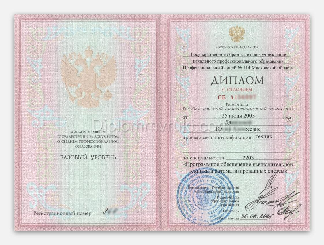 Если у вас есть возможность получить более выгодную должность или, к примеру, желание продолжить обучение в вузе, но диплома техникума 2004 года нет, то мы предлагаем вам купить его. Это решит много проблем, и вы не потратите драгоценные время и деньги, оплачивая каждый год обучения. Мы готовы сделать этот заказ срочно. Чем быстрее вы оформите заказ, тем быстрее мы приступим к его выполнению. По всем возникшим вопросам вы можете обратиться за помощью к нашему менеджеру, который поможет разобраться со всеми нюансами.
