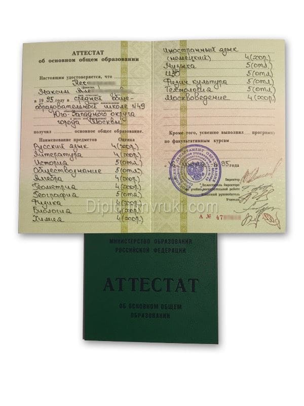 Аттестат об окончании 9 класса 1995 года представлял собой твердую корочку со вписанными дисциплинами внутри и оценками. Там были специальные элементы защиты, мокрая печать, наименование учебного заведения, подпись руководителя школы. Наша компания занимается изготовлением дипломов, справок и аттестатов более 15 лет, поэтому мы отлично разбираемся в специфике изготавливаемых документов. У нас есть все необходимое оборудование для печати и дорогостоящие оригинальные бланки. Все сотрудники проходят специальное обучение, поэтому смогут помочь разобраться во всех сложностях. Для заказа достаточно позвонить нам или написать в специальное чат-окно в углу экрана. Мы работаем круглосуточно.